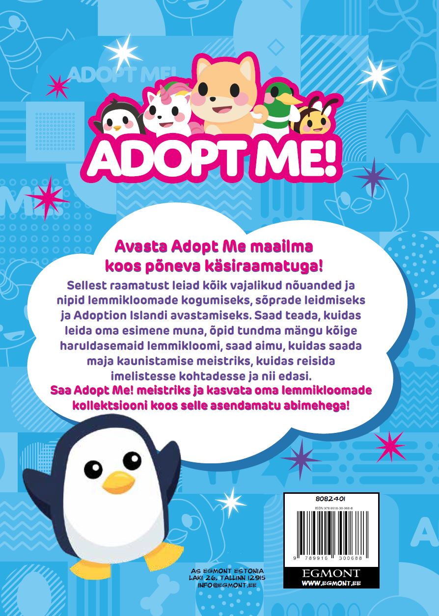 Avasta Adopt Me maailma koos põneva käsiraamatuga! Sellest raamatust leiad kõik vajalikud nõuanded ja nipid lemmikloomade kogumiseks, sõprade leidmiseks ja Adoption Islandi avastamiseks. Saad teada, kuidas leida oma esimene muna, õpid tundma mängu kõige haruldasemaid lemmikloomi, saad aimu, kuidas saada maja kaunistamise meistriks, kuidas reisida imelistesse kohtadesse ja nii edasi. Saa Adopt Me! meistriks ja kasvata oma lemmikloomade kollektsiooni koos selle asendamatu abimehega!