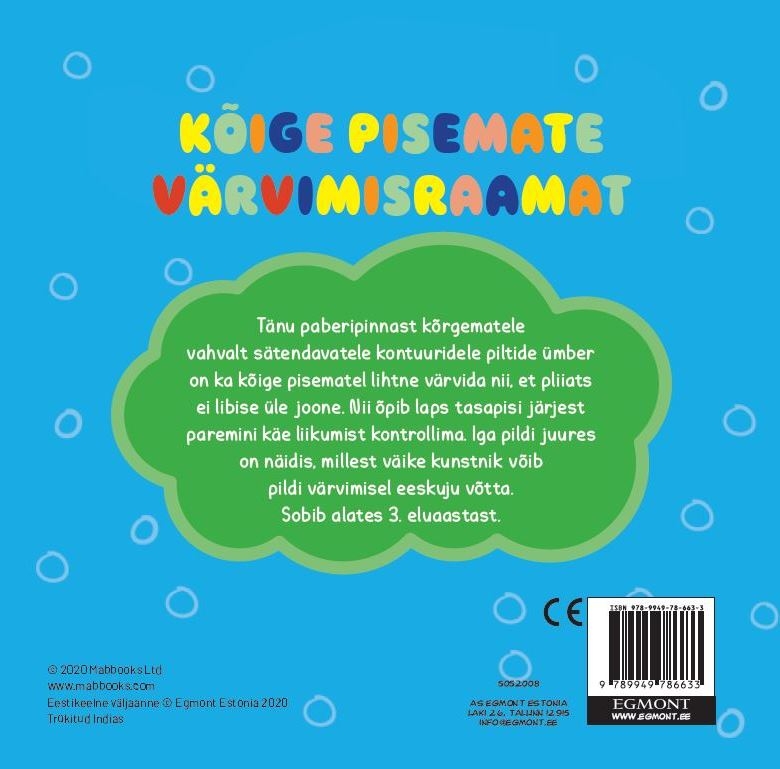 Tänu paberipinnast kõrgematele vahvatele sätendavatele kontuuridele piltide ümber on ka kõige pisematel lihtne värvida nii, et pliiats ei libise üle joone. Nii õpib laps tasapisi järjest paremini käe liikumist kontrollima. Iga pildi juures on näidis, millest väike kunstnik võib pildi värvimisel eeskuju võtta. Sobib alates 2. eluaastast.