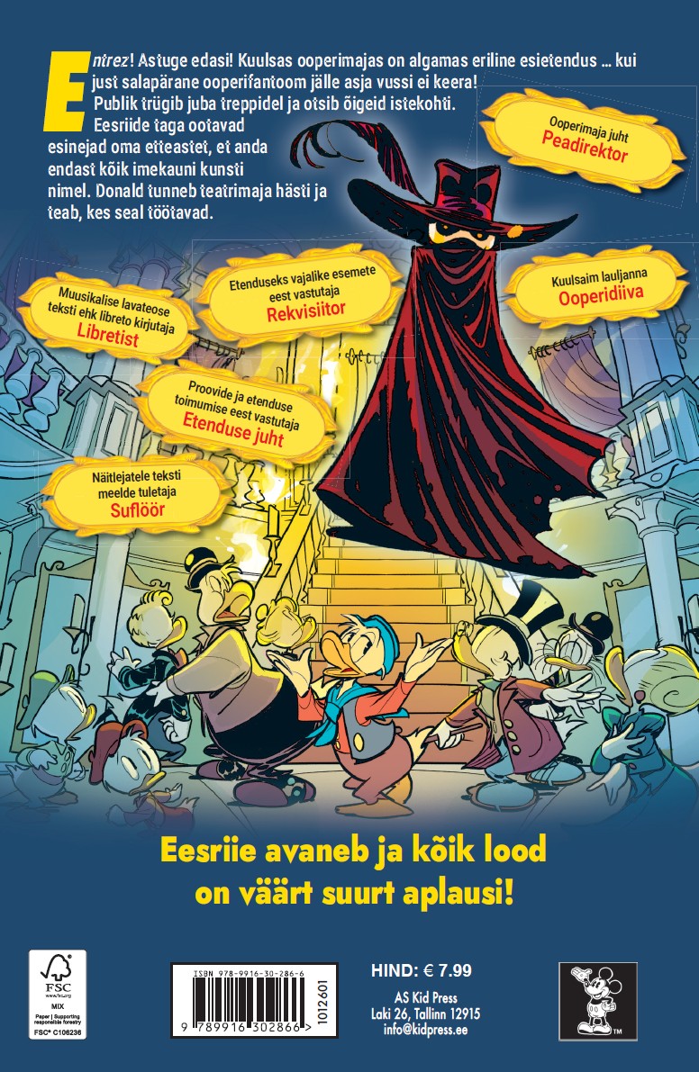 Entrez! Astuge edasi! Kuulsas ooperimajas on algamas eriline esietendus… kui just salapärane ooperifantoom jälle asju vussi ei keera! Publik trügib juba treppidel ja otsib õigeid istekohti. Eesriide taga ootavad esinejad oma etteastet, et anda endast kõik imekauni kunsti nimel. Donald tunneb teatrimaja hästi ja teab, kes seal töötavad. Eesriie avaneb ja kõik lood on väärt suurt aplausi!