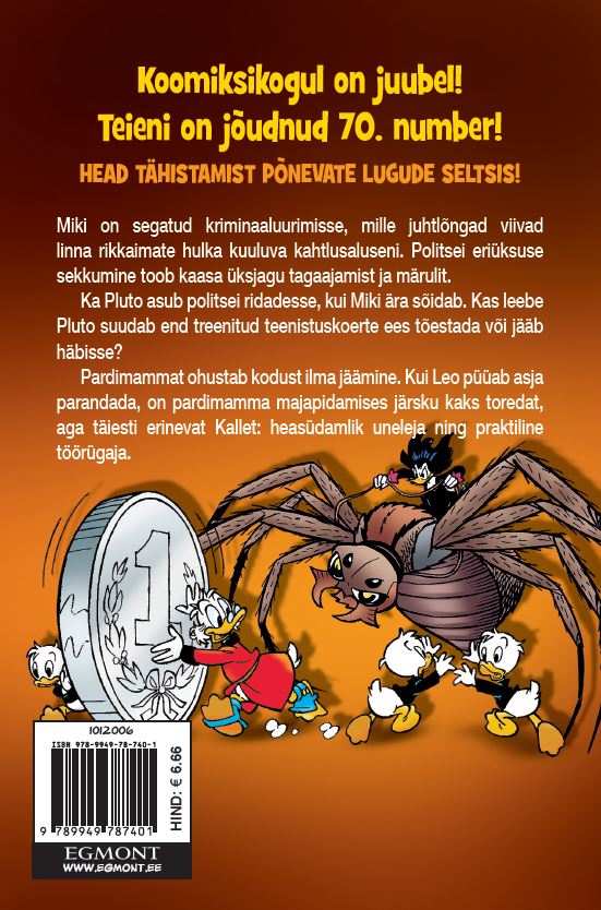 Koomiksikogul on juubel! Teieni on jõudnud 70. number! Head tähistamist põnevate lugude seltsis! Miki on segatud kriminaaluurimisse, mille juhtlõngad viivad linna rikkaimate hulka kuuluva kahtlusaluseni. Politsei eriüksuse sekkumine toob kaasa üksjagu tagaajamist ja märulit. Ka Pluto asub politsei ridadesse, kui Miki ära sõidab. Kas leebe Pluto suudab end treenitud teenistuskoerte eest tõestada või jääb häbisse? Pardimammat ohustab kodust ilma jäämine. Kui Leo püüab asja parandada, on pardimamma majapidamises järsku kaks toredat aga täiesti erinevat Kallet: heasüdamlik uneleja ning praktiline töörügaja. NB! TEGEMIST ON VIIMASTE KOOPIATEGA, MILLE KAANED VÕIVAD OLLA PISUT KANNATADA SAANUD, SISU SELLEGIPOOLEST AEGUMATU!