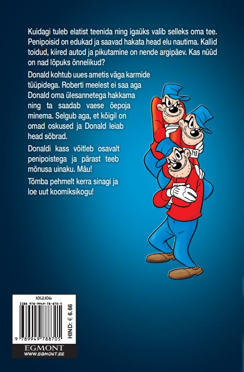 Kuidagi tuleb elatist teenida ja igaüks valib selleks oma tee. Penipoisid on edukad ja saavad hakata head elu nautima. Kallid toidud, kiired autod ja pikutamine on nende argipäev. Kas nüüd on nad lõpuks õnnelikud? Donald kohtub uues ametis väga karmide tüüpidega. Roberti meelest ei saa aga Donald oma ülesannetega hakkama ning ta saadab vaese õepoja minema. Selgub aga, et kõigil on omad oskused ja Donald leiab head sõbrad. Donaldi kass võitleb osavalt penipostega ja pärast teeb mõnusa uinaku. Mäu! Tõmba pehmelt kerra sinagi ja loe uut koomiksikogu!
