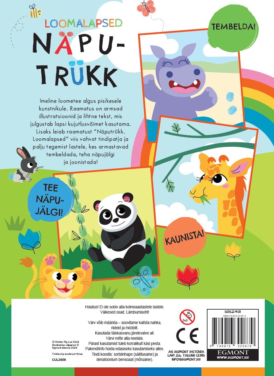 Imeline loometee algus pisikesele kunstnikule. Raamatus on armsad illustratsioonid ja lihtne test, mis julgustab lapsi kujutlusvõimet kasutama. Lisaks leiab raamatust “Näputrükk. Loomalapsed” viis vahvat tindipatja ja palju tegemist lastele, kes armastavad tembeldada, teha näpujälgi ja joonistada!