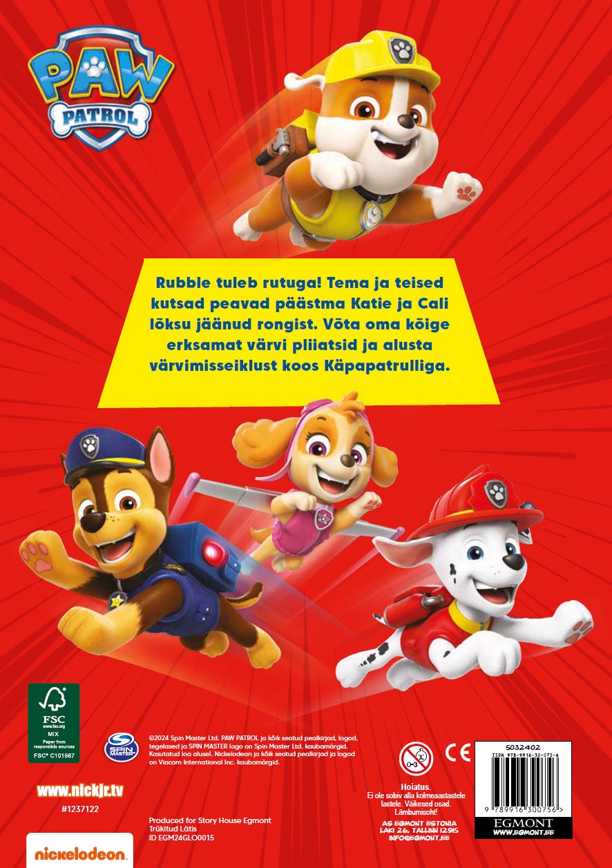 Rubble tuleb rutuga! Tema ja teised kutsad peavad päästma Katie ja Cali lõksu jäänud rongist. Võta oma kõige erksamad pliiatsid ja alusta värvimisseiklust koos Käpapatrulliga. NB! TEGEMIST ON VIIMASTE KOOPIATEGA, MILLE KAANED VÕIVAD OLLA PISUT KANNATADA SAANUD, SISU SELLEGIPOOLEST AEGUMATU!